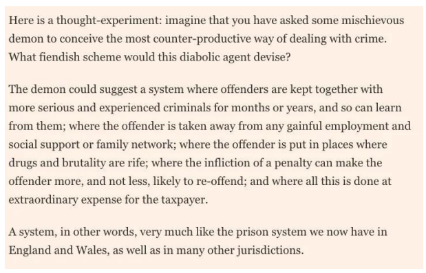 “The demon could suggest a system where offenders are kept together with more serious and experienced criminals for months or years, and so can learn from them; where the offender is taken away from any gainful employment and social support or family network; where the offender is put in places where drugs and brutality are rife; where the infliction of a penalty can make the offender more, and not less, likely to re-offend; and where all this is done at extraordinary expense for the taxpayer.